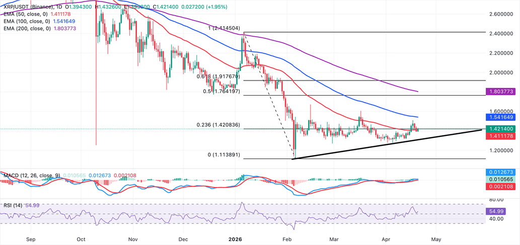 Ripple ($XRP) sube por encima de 1.42$ al momento de escribir el lunes, tras dos días consecutivos de corrección del precio desde el máximo de la semana pasada de 1.47$. Parece formarse un nivel de soporte fuerte en la resistencia rota alrededor de 1.40$, aumentando las probabilidades de un rebote sostenido.