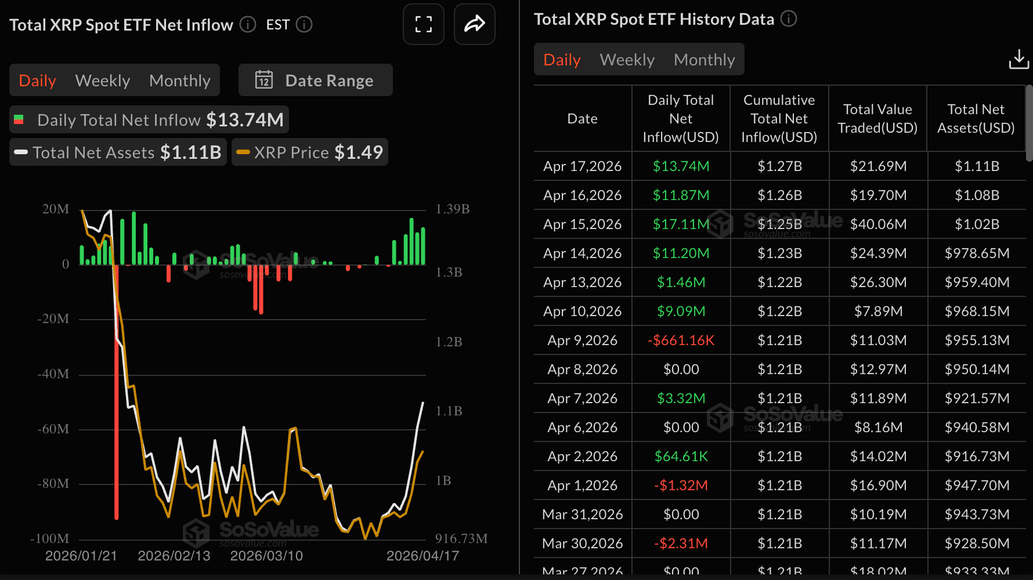 Los ETF de $XRP al contado extendieron su racha alcista por sexto día consecutivo con casi 14 millones de dólares en entradas el viernes. Las entradas acumuladas alcanzaron 1.27 mil millones de dólares el viernes, con activos netos bajo gestión promediando 1.11 mil millones de dólares. El apetito constante por el riesgo se alinea con el sentimiento en mejora y el creciente potencial de recuperación de $XRP.