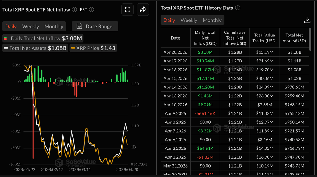 Mientras tanto, el interés institucional en productos de inversión relacionados se ha mantenido estable, como lo evidencian los ETFs al contado de $XRP que atrajeron 3 millones de dólares en entradas el lunes. Esto marcó el séptimo día consecutivo de entradas desde el 10 de abril, según datos de SoSoValue.