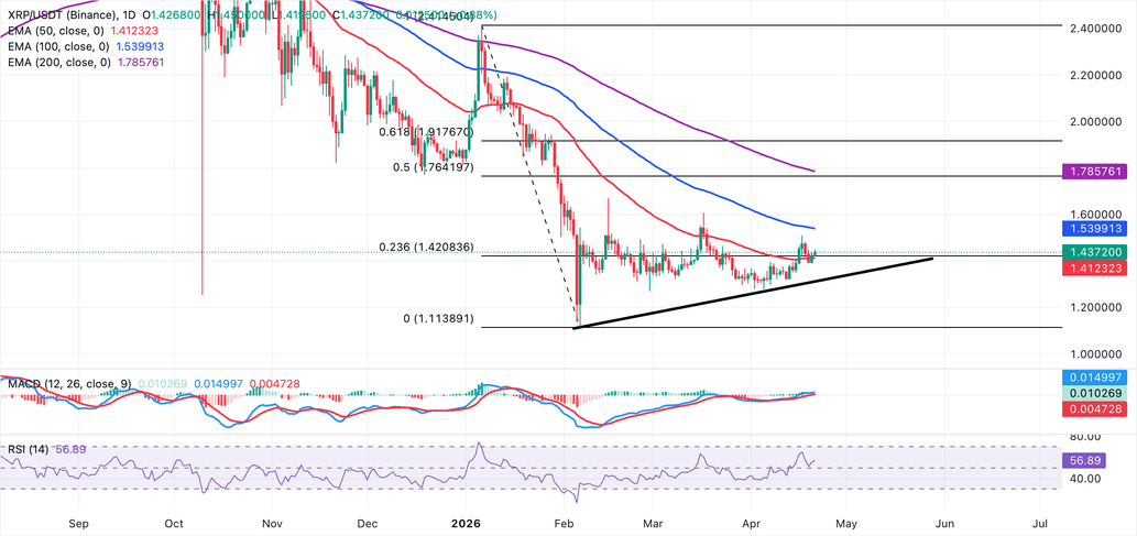 $XRP cotiza cerca de 1.44$, situándose por encima de la media móvil exponencial (EMA) de 50 días en 1.41$ y del retroceso de Fibonacci del 23.6% en 1.42$, aplicado entre el máximo del 6 de enero de 2.42$ y el mínimo de febrero de 1.12$, que juntos ofrecen soporte cercano a la baja. Aun así, el token de remesas permanece muy por debajo de la EMA de 100 días en 1.54$ y de niveles superiores de retroceso de Fibonacci.