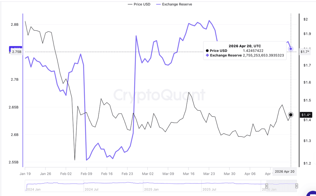 Por otro lado, las reservas de $XRP en el exchange Binance parecen estar disminuyendo, promediando 2.76 mil millones de tokens al lunes, desde aproximadamente 2.77 mil millones de tokens el día anterior.