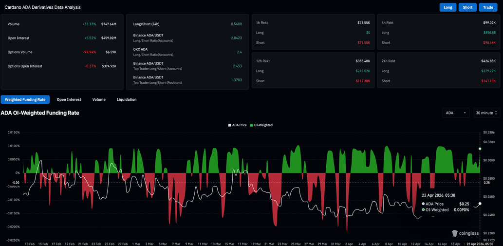 Cardano está ganando fuerza minorista gradualmente mientras el mercado más amplio de criptomonedas mantiene un tono mayormente recuperado en medio de la reaparición de las tensiones entre EE.UU. e Irán. Los datos de CoinGlass muestran que el interés abierto (OI) de los futuros de $ADA ha subido más del 5% en las últimas 24 horas hasta 459.02 millones de dólares, lo que sugiere una mayor actividad minorista en anticipación de movimientos bruscos. La tasa de financiamiento positiva de 0.0090% revela un matiz alcista en la acumulación posicional, ya que los compradores están dispuestos a mantener posiciones largas con una prima.