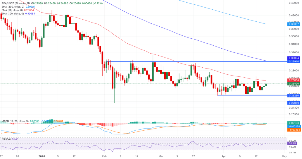 Cardano extiende su recuperación por encima de 0.2500$ al cierre de esta edición el miércoles, en medio de un sesgo bajista más amplio, ya que la media móvil exponencial (EMA) de 50 días en 0.2600$ limita los intentos al alza. Mientras tanto, las EMAs de 100 y 200 días en 0.3009$ y 0.3953$, respectivamente, actúan como resistencias superiores.