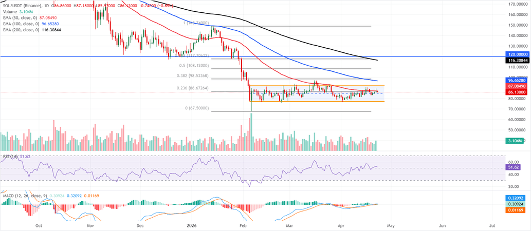 El precio de Solana cotiza a 86.13$ el jueves tras tres días consecutivos de ganancias hasta ahora esta semana. Sin embargo, la acción del precio mantiene un tono limitado, manteniéndose dentro de un canal paralelo y por debajo de las medias móviles exponenciales (EMA) de 50, 100 y 200 días. La presión inmediata proviene de la resistencia cercana en el retroceso de Fibonacci del 23.6% del último movimiento en 86.67$ y la EMA de 50 días en 87.08$, que el par no ha logrado recuperar hasta ahora.