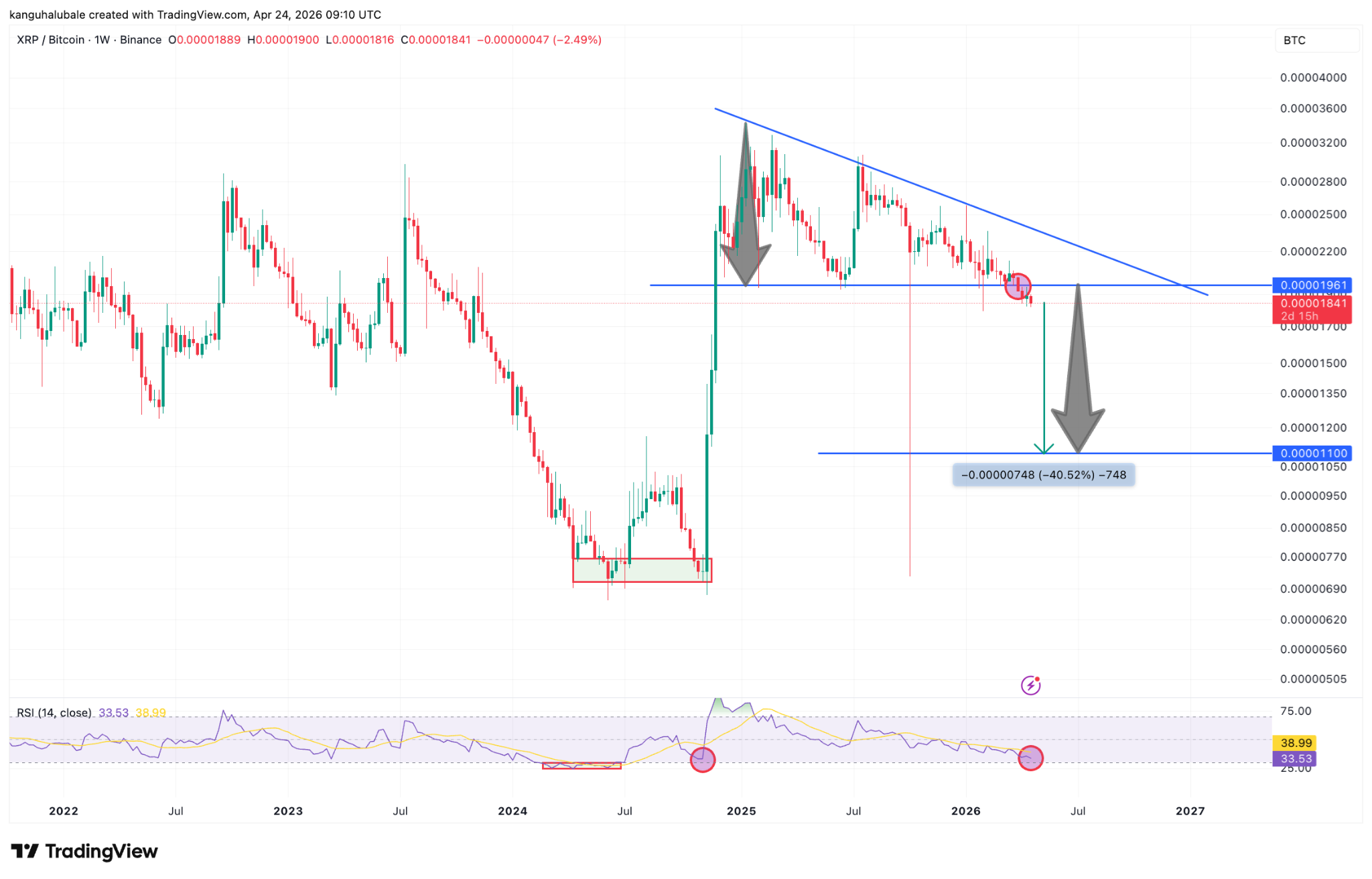 El patrón de triángulo descendente de $XRP/$BTC en el gráfico semanal apunta a una posible caída del 40%.