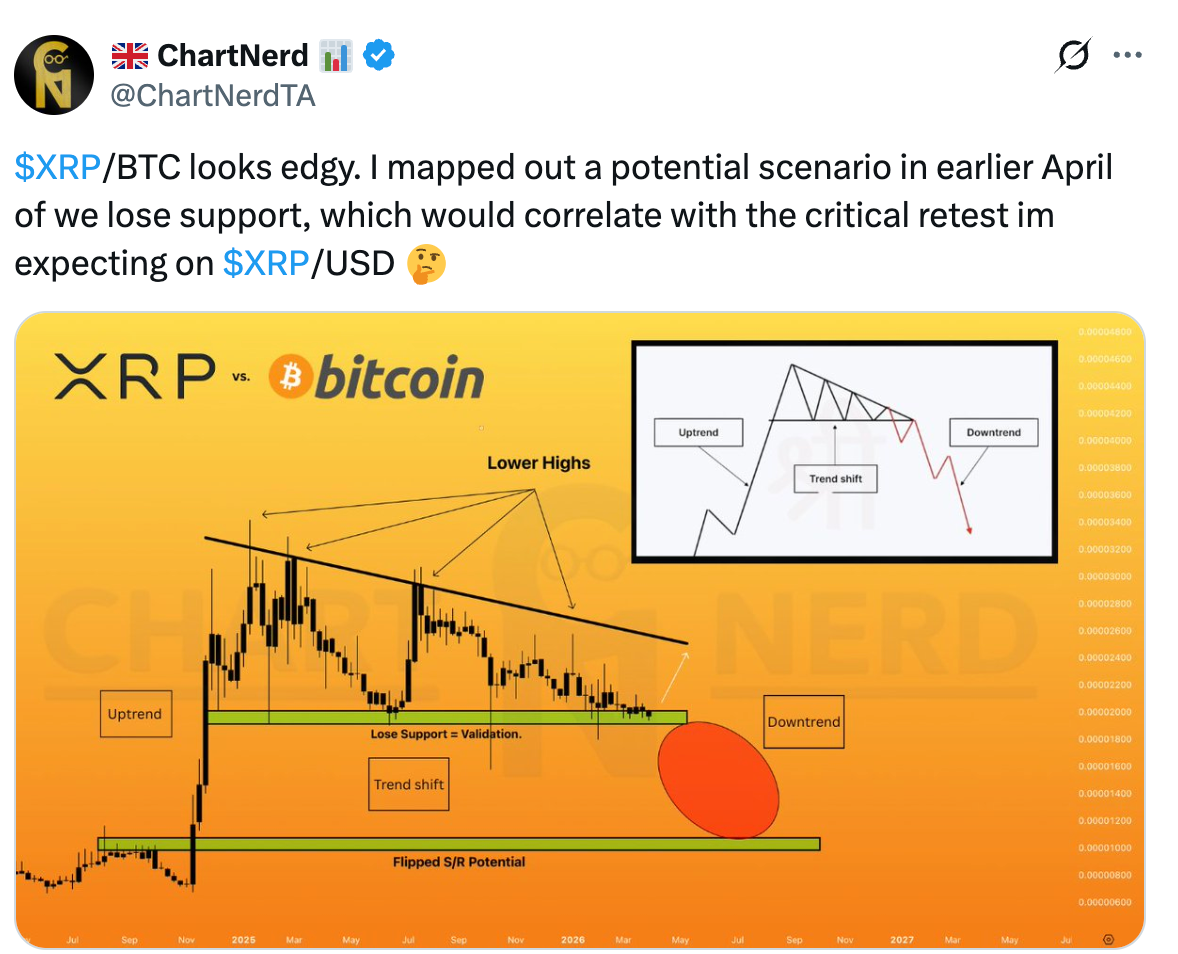 “El par $XRP/$BTC parece inestable”, dijo el analista técnico ChartNerd en una publicación reciente en X, añadiendo que perder el soporte en 0,000091 dólares llevaría a mayores pérdidas en la relación $XRP/$BTC, así como en el par $XRP/USD.