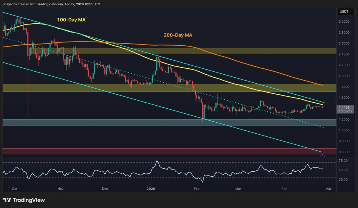 Por encima de ese nivel, los $1,80 siguen siendo la zona de resistencia clave. El área actuó como soporte a finales de 2025 antes de convertirse en resistencia tras la ruptura bajista de febrero. La media móvil de 200 días también está cayendo hacia ese mismo rango, reforzando el grupo de oferta.