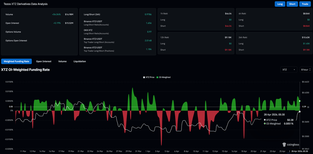 La recuperación a corto plazo en Tezos reconstruye la confianza minorista en la moneda de privacidad, lo que conduce a una mayor actividad comercial vinculada al apalancamiento. Los datos de CoinGlass muestran que el interés abierto (OI) de futuros de $XTZ ha aumentado más del 5% en las últimas 24 horas hasta 15.52 millones de dólares, indicando una mayor configuración posicional a medida que el sentimiento de riesgo se renueva entre los operadores.