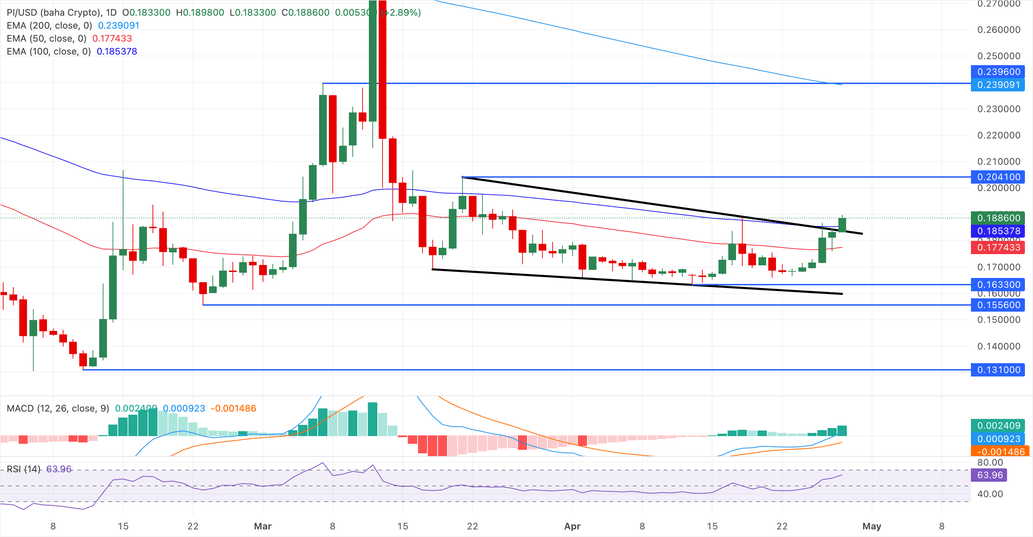 Pi Network mantiene un sesgo ligeramente alcista a corto plazo mientras el precio cruza por encima de la barrera de la EMA de 100 días en 0.1853$, alineándose con una línea de resistencia de un canal descendente. Mientras tanto, la EMA de 200 días cerca de 0.2390$ sigue siendo un techo lejano.
