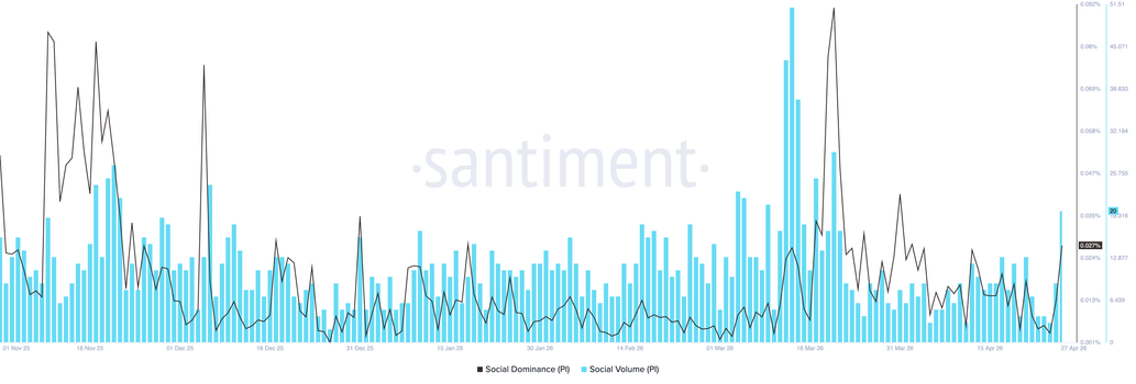 El regreso de Kokkalis al evento junto a su cofundador ha renovado la atención minorista en Pi Network. Los datos de Santiment muestran una recuperación en el interés social, con una dominancia social del 0.027% y un volumen social de 20 el lunes, respaldando el rally de cinco días.