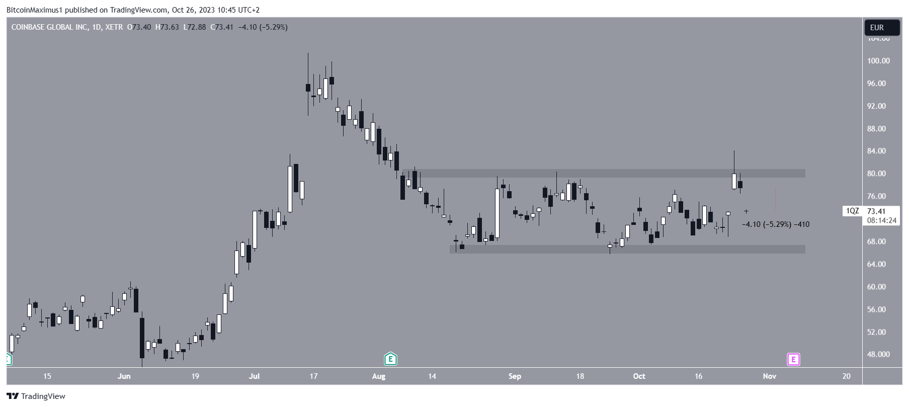 COIN ha cotizado entre 66 dólares y 80 dólares desde principios de agosto, y la discaídaminución colocó el precio en el medio de este rango de trading.