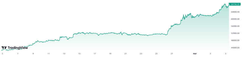 A escala global, el precio de BTC se ubica en 68,796 dólares tras registrar un aumento diario del 3.7%, según datos de BeInCrypto.