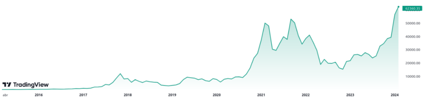 De esta forma, la criptomoneda líder acumula un aumento del 56% en el último mes y un aumento histórico exponencial del 20,643%.