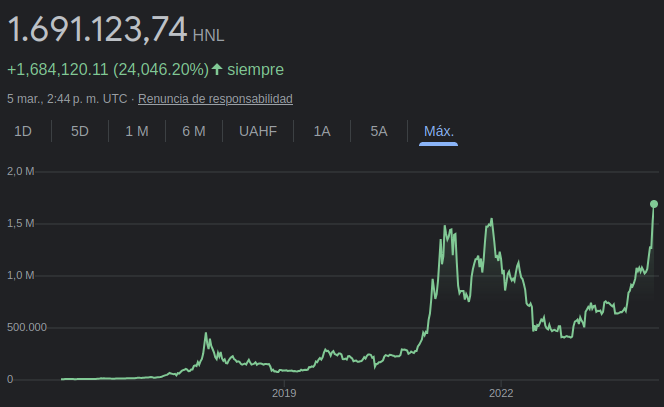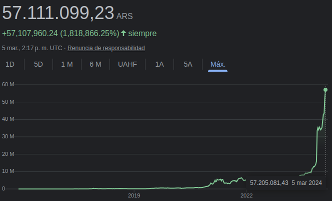Si se toma en consideración la tasa oficial, BTC registró un ATH de 58,08 millones de pesos, experimentando un aumento del 61% en los últimos 30 días y del 1,818,866.25% desde sus inicios.