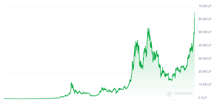 Bitcoin también registró un nuevo máximo histórico frente a la moneda de Chile. El día de ayer, BTC llegó a cotizar en 67,03 millones de pesos chilenos.
