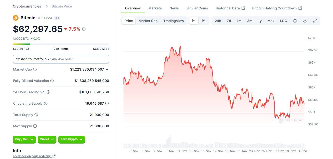 Bitcoin se desplomó el martes, poco después de que la criptomoneda número uno por capitalización de mercado alcanzara un nuevo máximo histórico de $69.170 en la mañana.