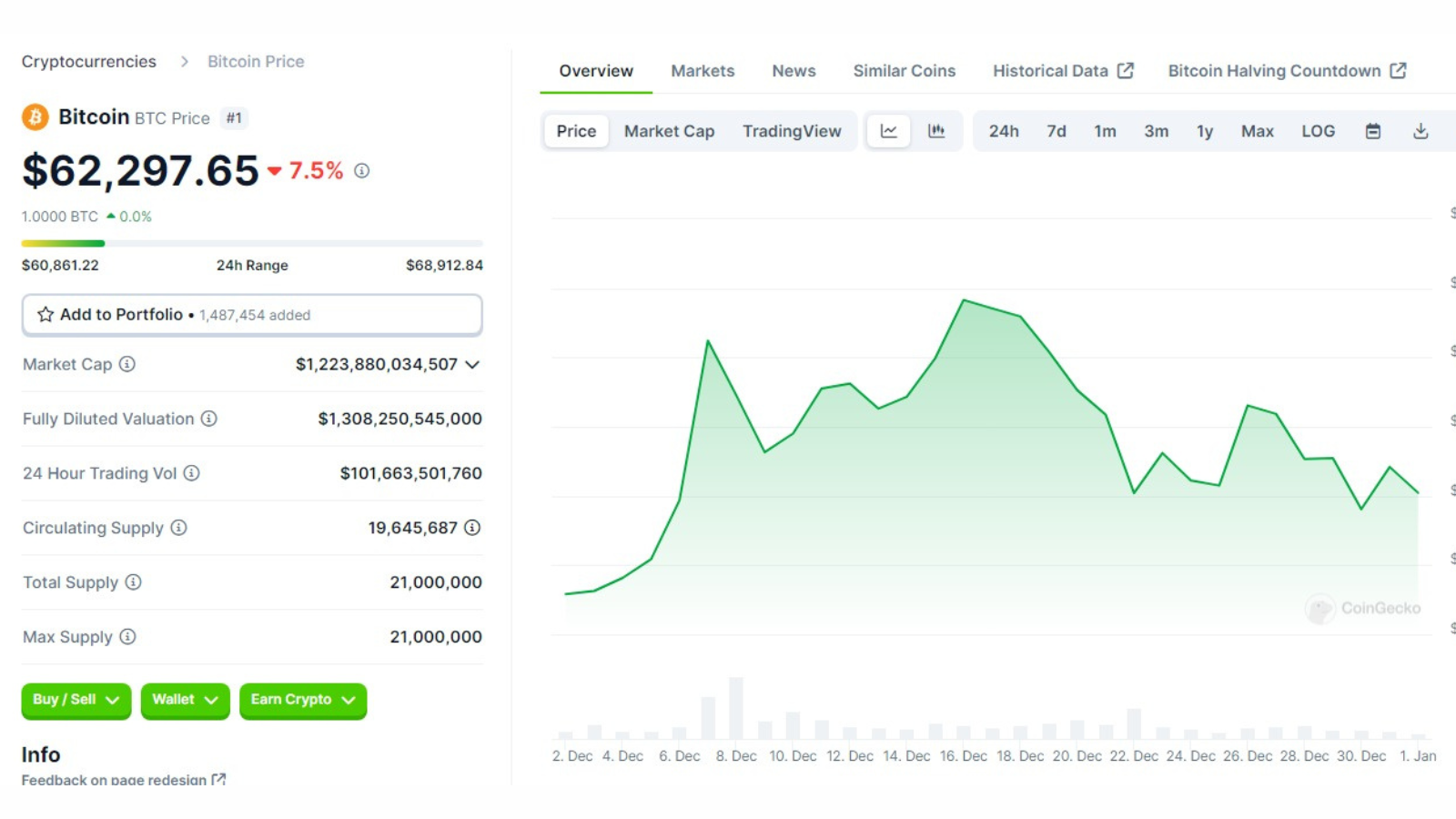 Según CoinGecko, Bitcoin cayó un 12% a poco más de $60.000 en cinco horas. Sin embargo, hoy se ha recuperado a $66.860, precio que mantiene al momento de redaccion de la nota. Por lo tanto, aunque la caída posterior al pico parezca aterradora, no es del todo inesperada.