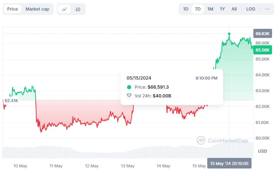 Durante la tarde del miércoles, la principal criptomoneda por capitalización de mercado retomó una altura de 66.000 dólares, vista por ultima vez a finales de abril. Las ganancias cercanas a 7% se extendieron durante la mañana de este jueves, cuando Bitcoin rondaba los USD $66.500. Pero el impulso duró poco, ya que la criptomoneda insigne no logró mantener la altura.