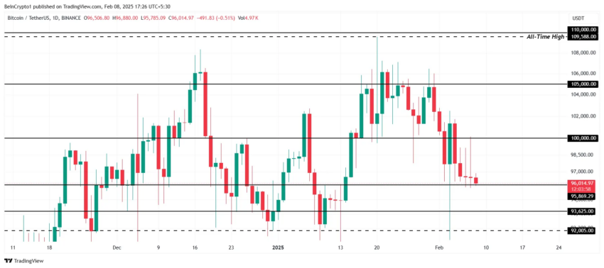 Aunque los holders de $BTC se han abstenido de tomar ganancias significativas, más pérdidas podrían desencadenar una ola de ventas. Este escenario pondría presión adicional sobre el precio, extendiendo la corrección de Bitcoin. Por otro lado, un rebote desde 95,869 dólares podría permitir que Bitcoin recupere el nivel de 100,000 dólares.
