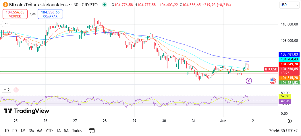 Bitcoin parece estar tomándose un respiro y consolidándose en un rango entre los $104.000 y $104.300 que mencionamos al inicio. La caída por debajo del primer nivel o la subida por encima del segundo determinará la próxima dirección del precio.