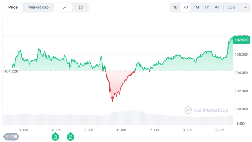 BTC cambia de manos en torno a los USD $107.600 al momento de escribir estas líneas, un 1,72% más alto en 24 horas y 3,8% por debajo de su máximo de precio histórico cercano a USD $112.000, conquistado el 22 de mayo, según CoinMarketCap.