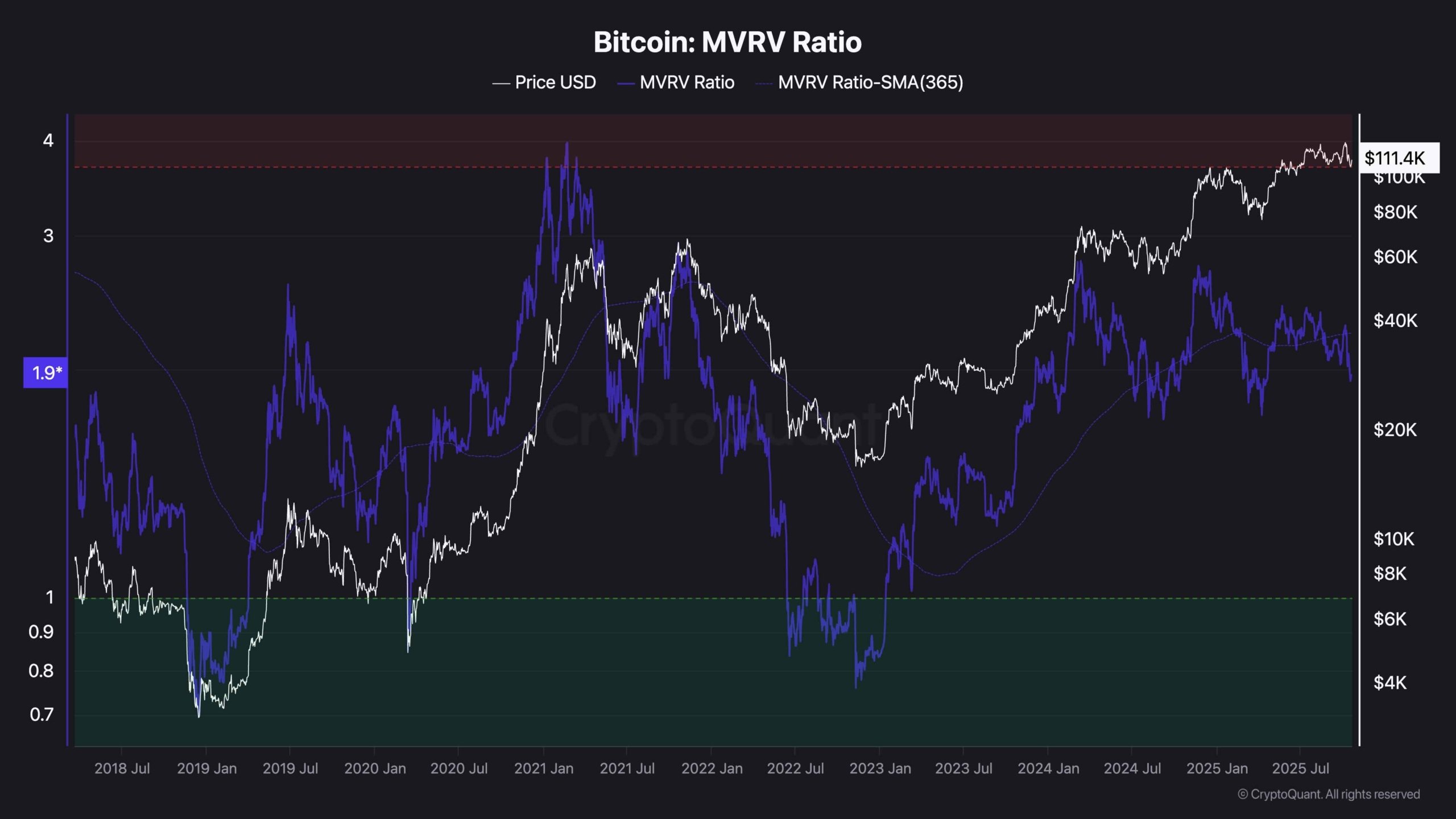 El ratio MVRV de Bitcoin (valor de mercado frente a valor realizado) se sitúa cerca de 1,9, ligeramente por debajo de su media móvil de 365 días. Históricamente, cada vez que el ratio cayó por debajo de la SMA de 365 días, señaló oportunidad de compra y un suelo local, como se observó a mediados de 2021, en junio de 2022 y a inicios de 2024.
