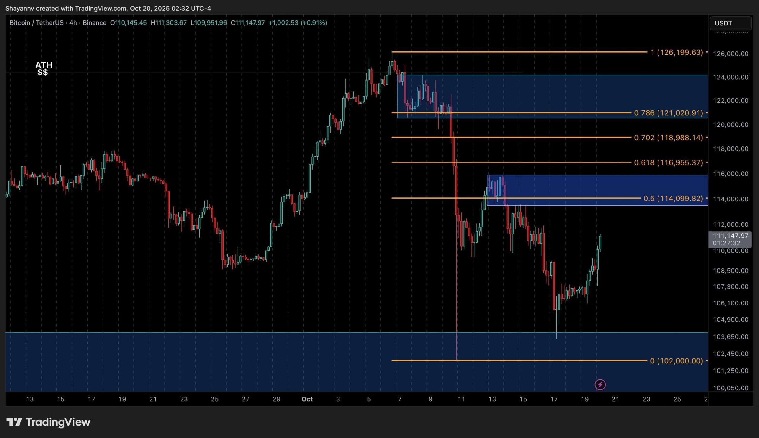 La estructura de 4 horas muestra un rally de retroceso de manual, con el precio recuperando mínimos crecientes tras la fuerte reacción desde $102.000–$104.000. Actualmente, Bitcoin se consolida bajo el clúster de retroceso de Fibonacci 0,5–0,618 ($114.000–$117.000), alineado con la base del rango anterior y un bloque de órdenes local.