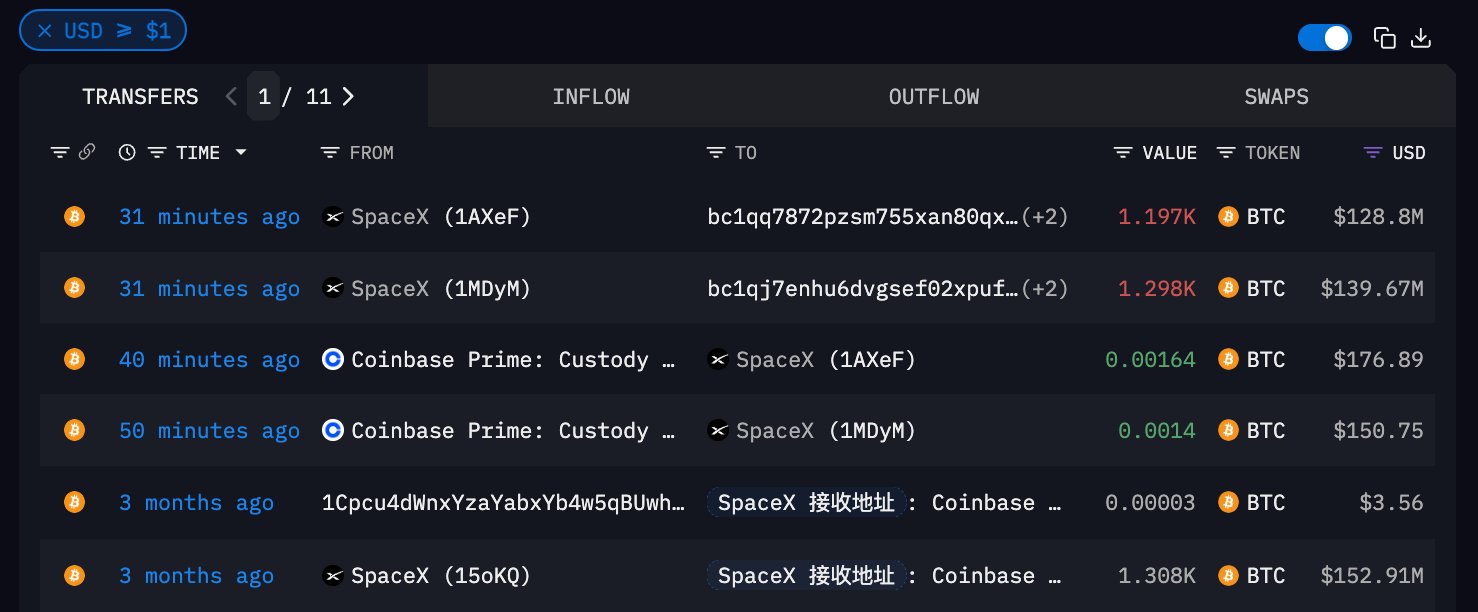 - SpaceX transfirió 2,495 BTC por $268.5 millones, marcando una gran transacción.