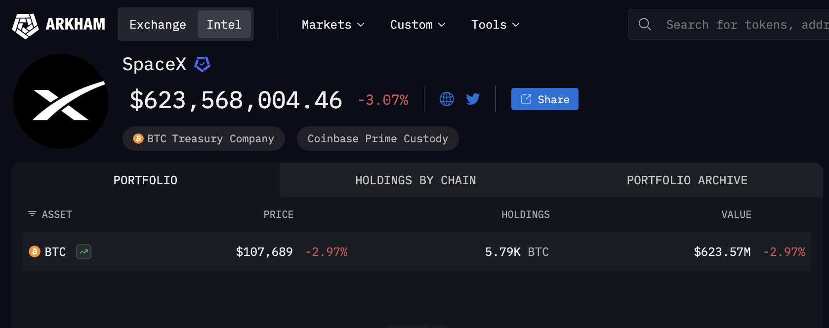 A mediados de 2022, tras el colapso de Terra-Luna y la bancarrota de FTX, SpaceX redujo sus reservas en aproximadamente un 70%, optando por no comprar nuevos Bitcoin durante el posterior temblor del mercado. De manera similar, la otra empresa de Musk, Tesla, vendió una parte sustancial de sus tenencias de Bitcoin durante el mismo período. Según Arkham, Tesla actualmente tiene $1.24 mil millones en 11,509 Bitcoins.