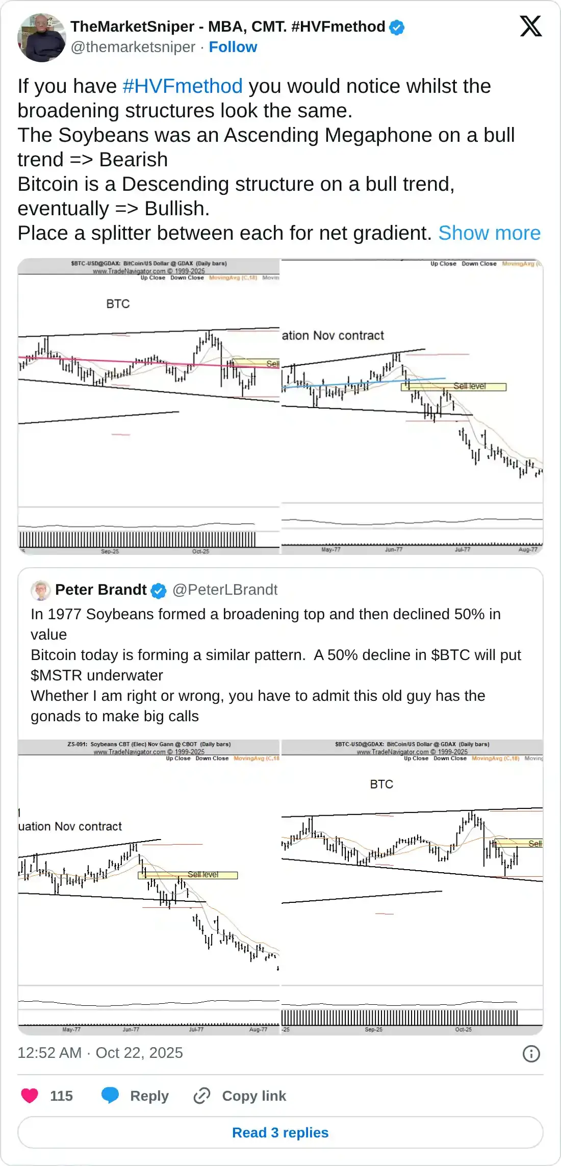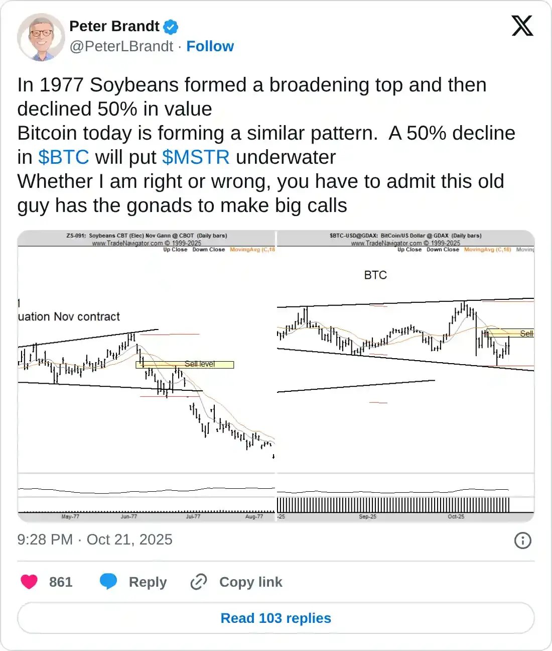 Brandt compara el máximo ampliado del Bitcoin con una tendencia similar vista anteriormente en la soja, antes de su colapso en 1977, que resultó en una caída del 50%. El analista comparte una advertencia de caída similar del 50% en el BTC, que podría superar el precio de compra promedio de la tenencia de Bitcoin de Microstrategy (MSTR).