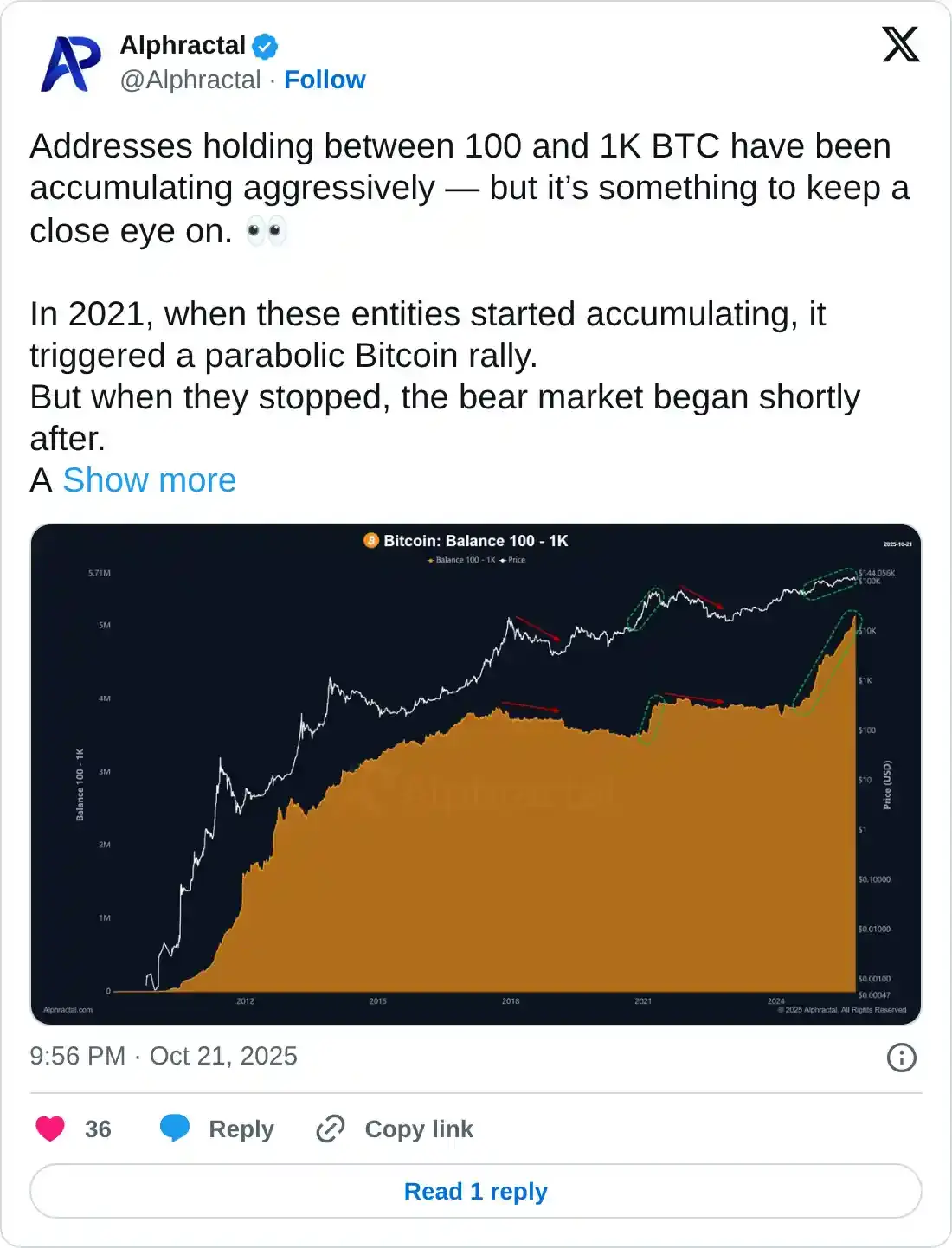 Alphractal, una plataforma de análisis de datos de criptomonedas, compartió una racha de compras en curso entre inversores con 100 a 1.000 BTC desde principios de 2024. Se observó una ola de compras similar en este grupo de operadores antes del movimiento alcista de 2021. Sin embargo, una pausa en su tendencia de compra se alinea con los picos de los ciclos de 2017 y 2022.