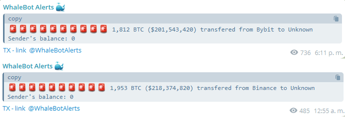 Desde Coinbase salió otro envío de casi 1.000 BTC durante la misma jornada. El mismo viernes 1.812 bitcoins abandonaron Bybit en una transacción. A todo esto se suman fuertes entradas de stablecoins hacia los CEX, lo que generalmente aumenta la presión de compra.