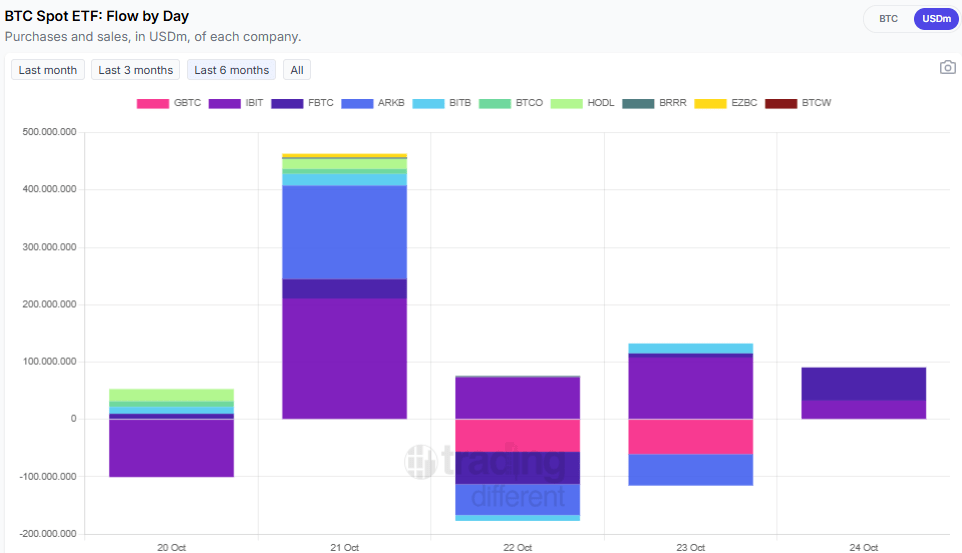 Según datos de Trading Different, esta semana fue positiva para los ETF de Bitcoin, con solamente dos días de flujos de salida dominantes (lunes y miércoles). En esas jornadas se contaron salidas de $141.8 millones. El resto de las jornadas totalizaron flujos de entrada de $588.1 millones.