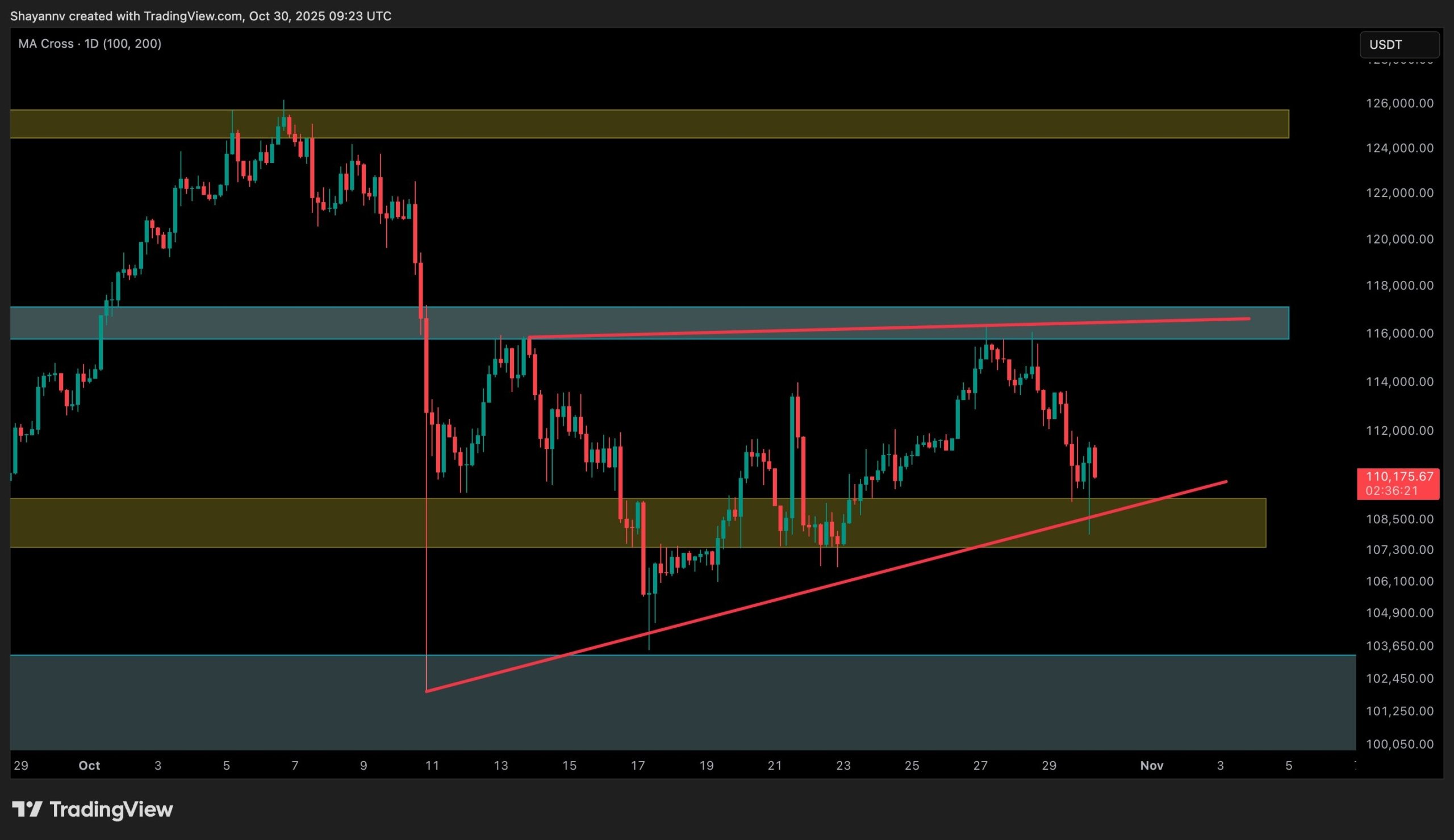En 4 horas, BTC respeta una línea de tendencia ascendente que conecta los mínimos crecientes desde mediados de octubre. El retroceso desde la resistencia de $116.000 llevó el precio de vuelta a este soporte en ascenso, alineado con el área de alta liquidez de $108.000–$109.000.