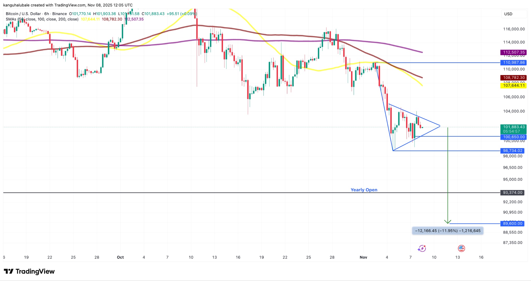 Una ruptura por debajo de la línea de soporte del banderín, situada en 100.650 dólares, podría conducir al siguiente tramo bajista hacia los 89.600 dólares, equivalente a una caída del 12% desde los niveles actuales.