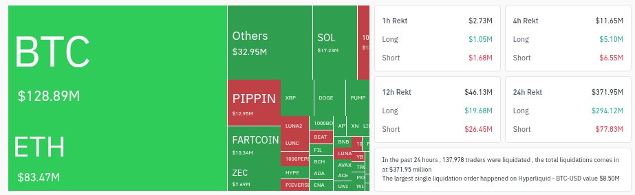 En general, durante las últimas 24 horas, las liquidaciones en el mercado cripto ascienden a casi 372 millones de dólares. De este total, 294 millones de dólares corresponden a posiciones largas.