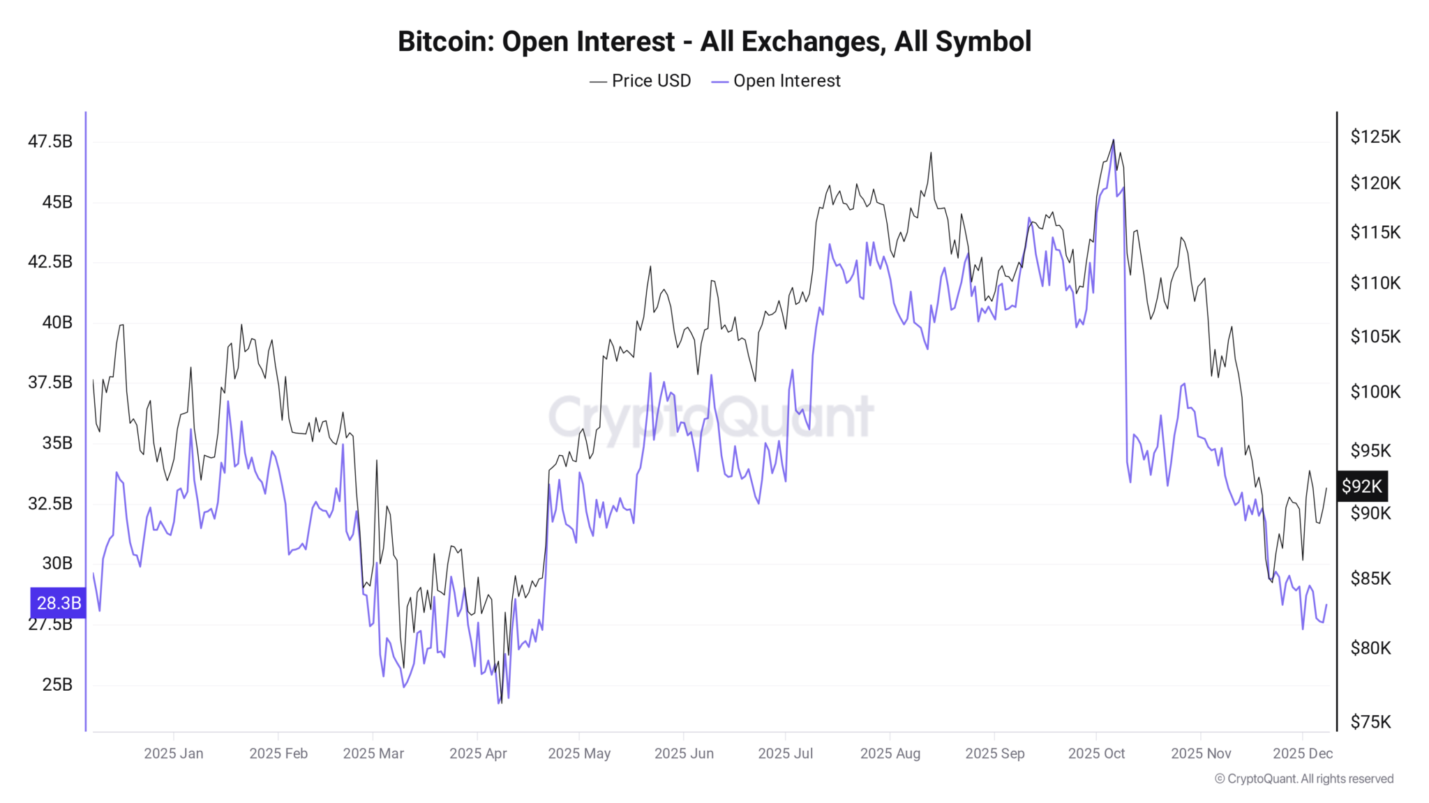 Las señales del mercado provenientes de derivados respaldan este tono cauteloso. Nuevos datos de CryptoQuant muestran que el interés abierto en los principales intercambios ha caído a su nivel más bajo desde abril. El analista Coindream explica que estas caídas suelen indicar apatía de los inversores o capitulación leve, ambas historicamente han creado oportunidades para comprar en las caídas. Las ratios de apalancamiento también han bajado drásticamente desde mediados de noviembre, reduciendo la presión estructural y creando una configuración de mercado más saludable.