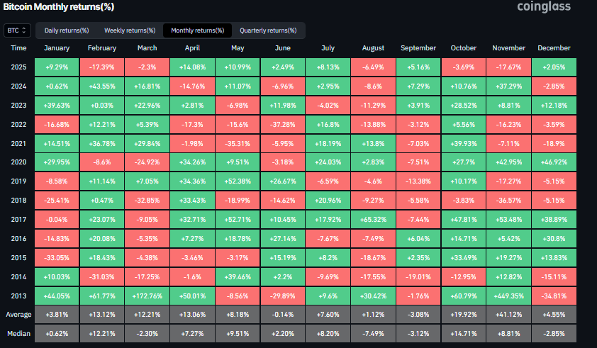 Al observar los datos trimestrales, el cuarto trimestre (Q4) ha sido el mejor trimestre para el BTC en general, con un retorno promedio del 77.38%. Sin embargo, el rendimiento en los últimos tres meses de 2025 ha sido decepcionante hasta ahora, registrando por ahora una pérdida del 19%.