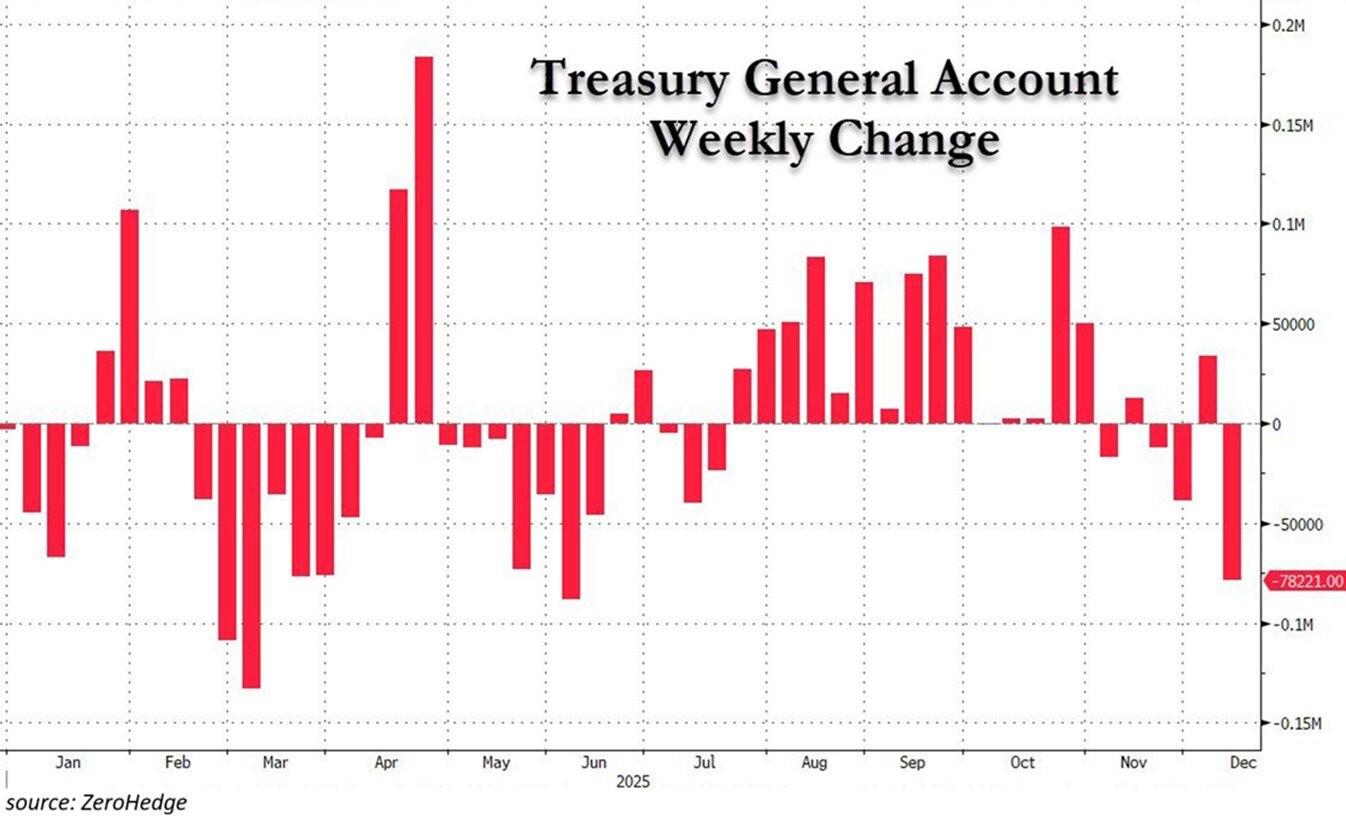 El informe explicó que la Cuenta General del Tesoro (TGA) cayó a 78.000 millones de dólares durante la última semana, la mayor inyección de liquidez desde junio, como se muestra en el gráfico a continuación. El analista señaló que la TGA es la cuenta de efectivo principal del gobierno de EE.UU. en la Reserva Federal (Fed), y que cuando disminuye, el efectivo fluye directamente al sistema financiero, aumentando la liquidez.