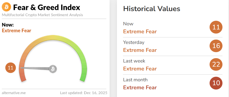 El Índice de Miedo y Avaricia ha caído a 11 el martes, acercándose a los mínimos de finales de noviembre, indicando un cambio brusco hacia el miedo extremo mientras los participantes del mercado se preparan para un mayor descenso.