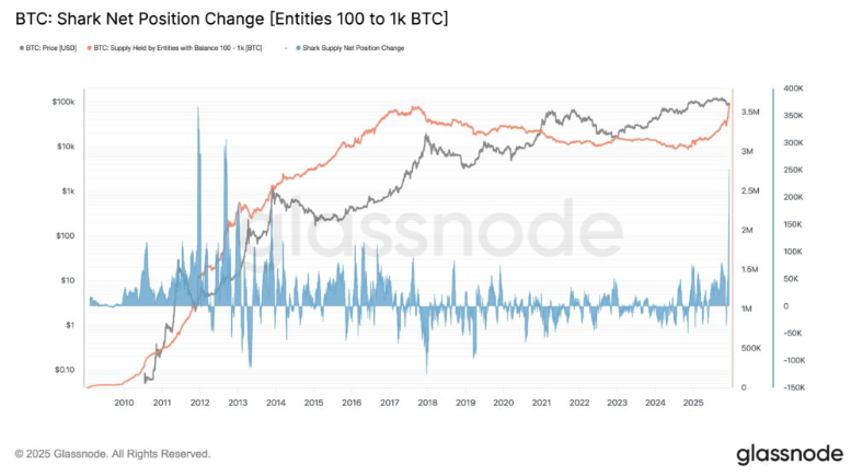 Los llamados “tiburones” de Bitcoin, carteras que concentran entre 100 y 1.000 $BTC, aprovecharon la debilidad del precio para reforzar posiciones y enviaron una señal que no pasó desapercibida en los datos on-chain.
