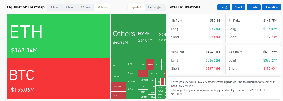 Del total liquidado, aproximadamente 365 millones de dólares correspondieron a posiciones largas y 153 millones de dólares a posiciones cortas. Este desequilibrio sugiere que muchos traders apostaron por continuidad alcista y fueron forzados a cerrar posiciones de forma automática.