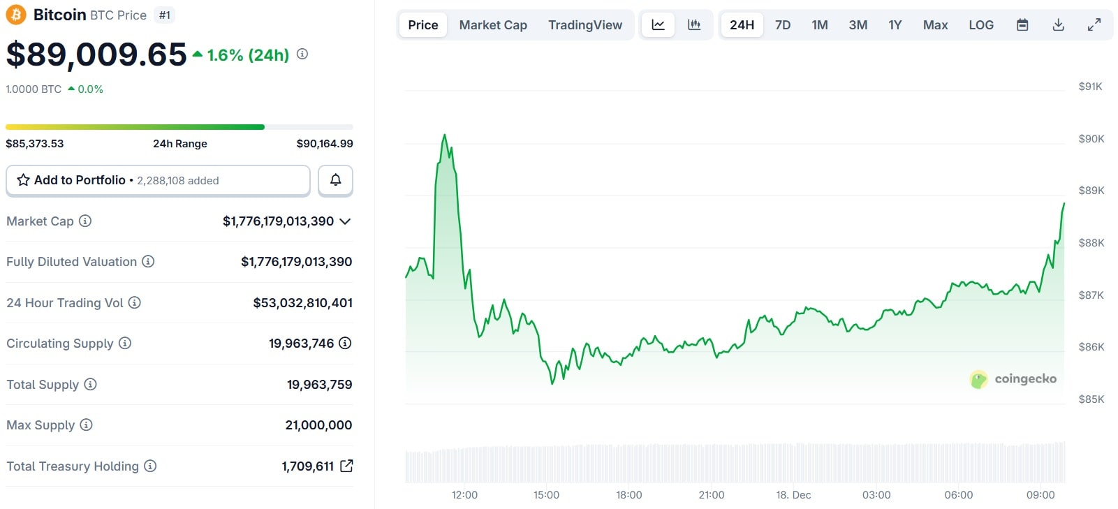 Según datos de CoinGecko, BTC cotizaba en torno a los 89.000 dólares al momento de la edición de este artículo, con un incremento de casi 2% en las últimas 24 horas, en medio de una acción bajista prolongada y fuerte volatilidad.