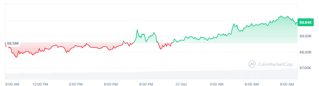 Según datos del portal CoinMarketCap, la mayor de las monedas virtuales en capitalización de mercado se cotiza por debajo de los $90.000 tras haber superado esta marca momentos antes. Ese precio representa un rendimiento de +2.44% en las últimas 24 horas. Asimismo, en el plazo semanal el desempeño del token recupera la franja positiva con un +0.43%.