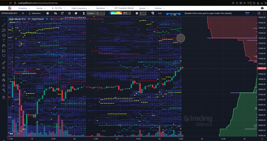 Esta posición puede observarse con claridad en Trading Different a través del Liquidation Heatmap del DEX Hyperliquid, una herramienta esencial para identificar dónde se concentran los traders más apalancados del mercado.
