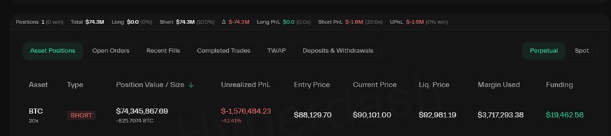 Según los datos extraídos de la plataforma, una ballena mantiene una posición short de 825 BTC, equivalente a aproximadamente $74,3 millones, utilizando un apalancamiento de 20x.