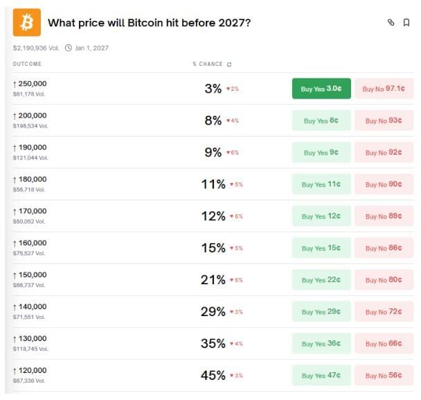 Según el mercado activo de Polymarket, que pregunta qué precio alcanzará Bitcoin antes de 2027, la apuesta de mayor confianza se sitúa actualmente en los 100.000 dólares, a la que los operadores asignan una probabilidad del 80%. Por encima de ese nivel, la confianza cae drásticamente.