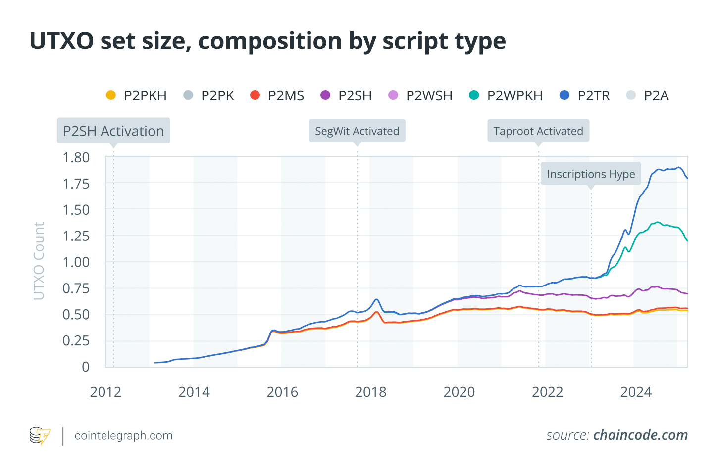 P2TR es común por número, alrededor del 32,5% de las UTXO, pero pequeño por valor en la misma instantánea, alrededor del 0,74% o 146.715 BTC. Su exposición está vinculada al diseño de la ruta de claves de Taproot, donde una clave pública modificada es visible onchain.