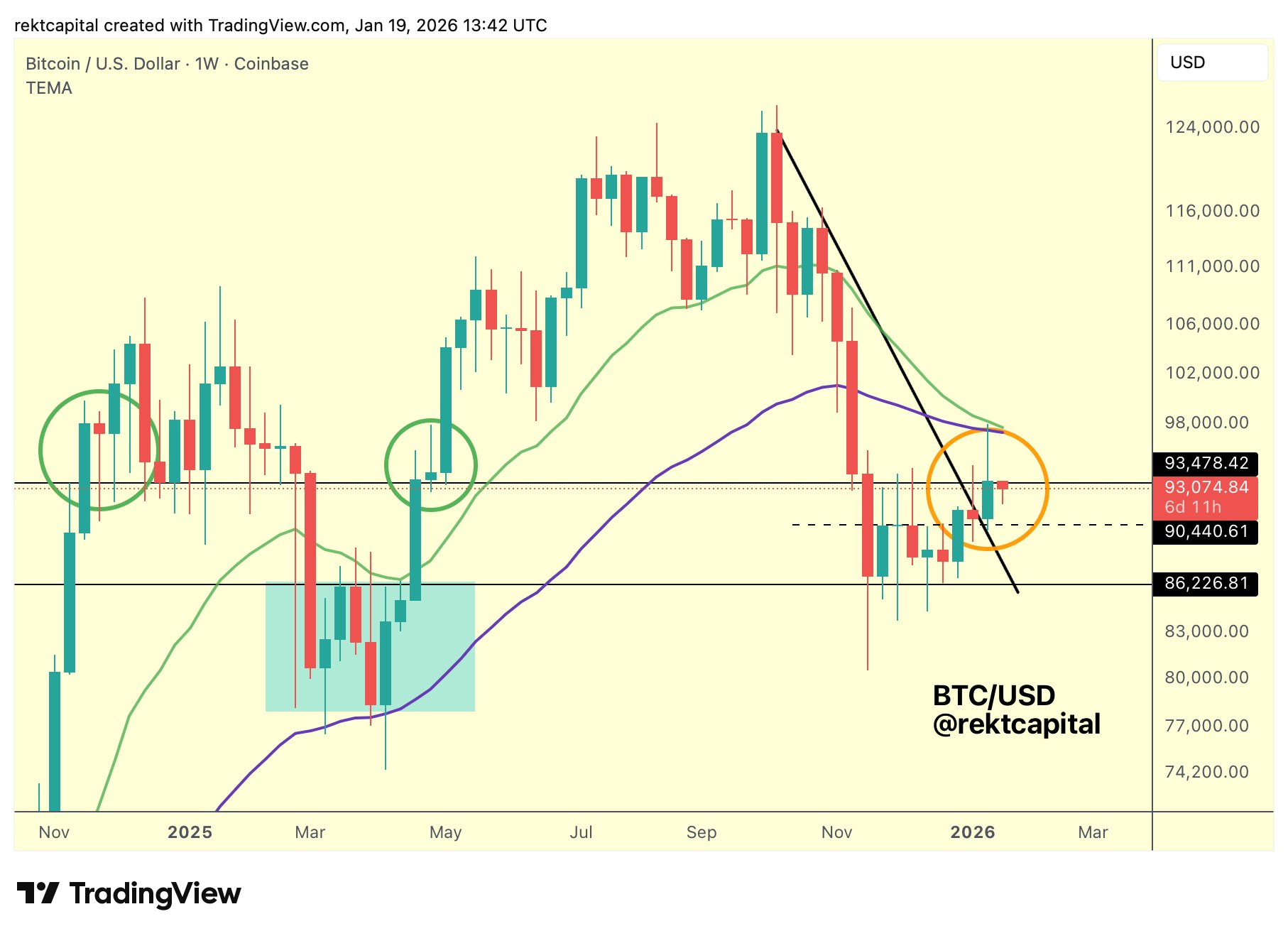 Por su parte, el trader y analista Rekt Capital se centró en la apertura anual de 2025 en 93.500 dólares, un nivel que era de vital importancia para el gráfico semanal.