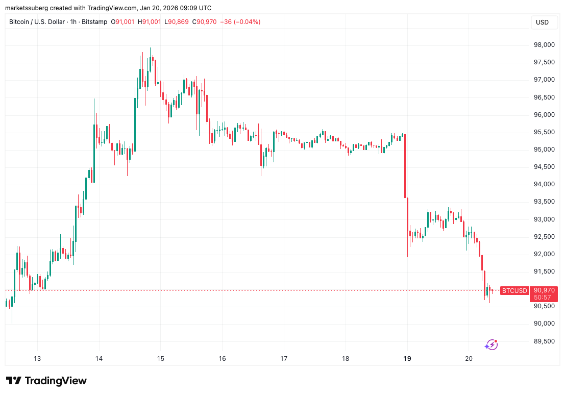 Los datos de TradingView mostraban que el precio de BTC volvía a apuntar a los 90.000 dólares antes de la primera sesión bursátil de la semana en Wall Street.
